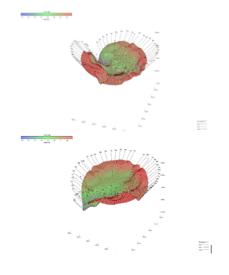 MAPPATURA – MISURAZIONI MANUALI Per la determinazione dell’altezza dei fondami agendo dal tetto, verranno eseguite diverse misurazioni dell’altezza compresa tra la superficie del fondame e il tetto galleggiante, di fatto occupato dal prodotto stoccato. I rilievi sono in grado di determinare sia lo spessore dell’interfase (soft Sludge) sia la superficie dello sludge, utilizzando una rotella metrica Atex con supporto finale allargato per non penetrare il fondame. I rilievi verranno eseguiti in un numero di punti in finzione della grandezza del serbatoio e dei rilievi effettuati sul mantello. Una volta raccolti i dati circa l’altezza dei fondami nei diversi punti del serbatoio, mediante lo specifico software SLUDGEVIEWER sviluppato appositamente per tali applicazioni, è possibile, elaborare grafici che mostrino in formato tridimensionale e interattivo il profilo e la distribuzione del fondame nel serbatoio. Tale Software, oltre a fornire un grafico in 3D della distribuzione del fondame all’interno del serbatoio, fornisce anche un’immagine della distribuzione dell’altezza dello stesso in funzione della scala di colore e calcola il volume del fondame presente. Si riportano di seguito un esempio di visualizzazione 3D del fondame presente in un serbatoio da punti di vista diametralmente opposti. Il canale centrale è dovuto al flusso generato dall’immissione e svuotamento del greggio nel serbatoio.