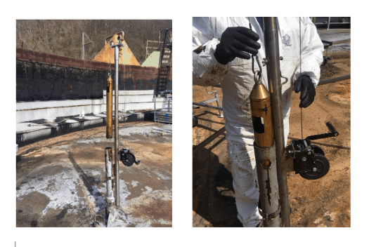 INDAGINE QUALITATIVA CAMPIONAMENTO DEI FONDAMI Questa fase prevede il prelievo di un numero significativo di campioni di fondame e, a seconda dello spessore dello stesso, verranno effettuati campioni a diversa profondità sulla stessa verticale. Il prelievo verrà effettuato con uno speciale campionatore in bronzo, progettato e realizzato da AVKEM, della lunghezza di oltre un metro e diametro tale per l’introduzione negli astucci delle gambe da 3”, in grado di penetrare il fondame e trattenerlo all’interno. Nel caso di carotaggi profondi, è prevista l’aggiunta di pesi addizionali da 10 Kg cad, che ne consentono una penetrazione veloce. Nella parte superiore del campionatore sono realizzate due aperture per la fuoriuscita del greggio e del fondame durante la discesa. Le attività di misurazione e campionamento potranno essere eseguite preferibilmente con il tetto alla massima altezza in modo da non incorrere in atmosfere classificate che richiedano l’utilizzo di aria insufflata. E’ esclusa l’attività di movimentazione delle gambe del tetto che è da effettuarsi a carico della Committente, il cui numero sarà in funzione della grandezza del serbatoio e della conformazione del fondame rilevato sul mantello.