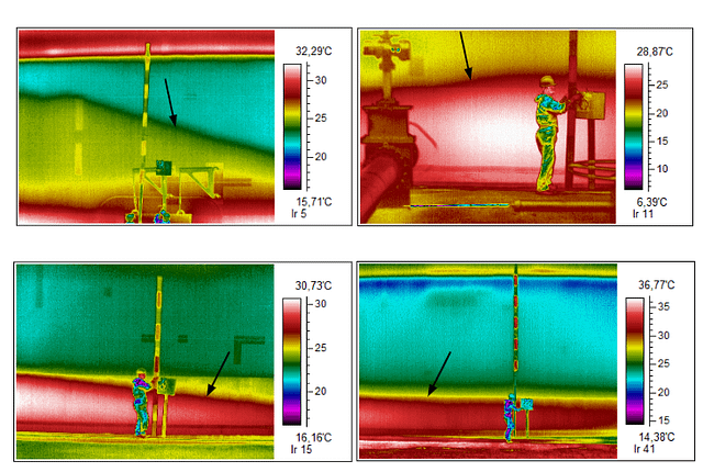 Le misure eseguite vengono elaborate in modo da ottenere lo sviluppo della distribuzione del fango all’interno del serbatoio lungo tutto il mantello del serbatoio. Di seguito sono riportate alcuni esempi di riprese termografiche. Nella parte bassa è visibile il fondame contenuto nel serbatoio, le frecce indicano l’interfaccia fango liquido, la stadia ha un’altezza di 2 mt.